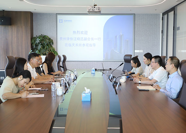 7月5日下午,貴州省律師協(xié)會副會長、律師行業(yè)團(tuán)委書記汪曉迅,副監(jiān)事長吳文兵,大數(shù)據(jù)和信息化專業(yè)委員會副主任傅舒、秘書長周穎蓉等一行蒞臨天禾所走訪調(diào)研。天禾所創(chuàng)始合伙人、安徽省律師協(xié)會副會長張曉健,合伙人包旺建、朱潔、楊軼接待考察調(diào)研并進(jìn)行交流座談。