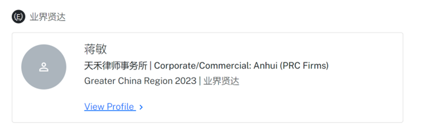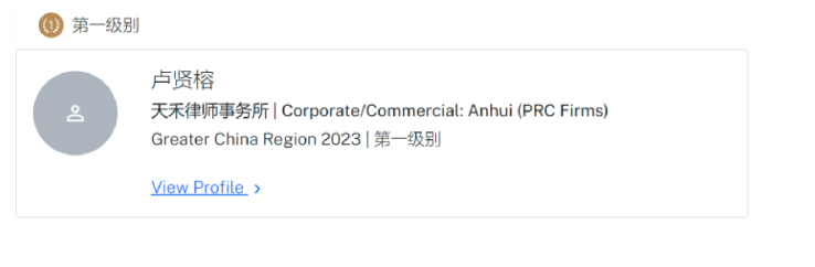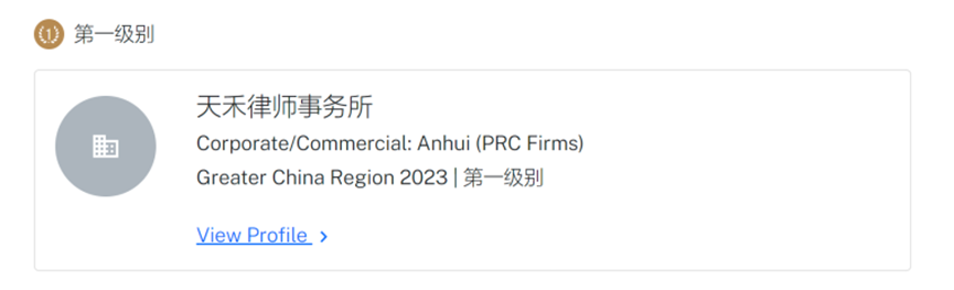 2023年1月13日,著名法律評(píng)級(jí)機(jī)構(gòu)錢伯斯(Chambers and Partners)發(fā)布了2023年度《大中華區(qū)指南》(Greater China Region Guide)榜單。天禾律師事務(wù)所憑借優(yōu)秀的市場(chǎng)表現(xiàn)和客戶口碑,連續(xù)第三年在公司/商事:安徽(中資律師事務(wù)所)領(lǐng)域入選,并被評(píng)為第一級(jí)別。創(chuàng)始合伙人蔣敏律師和事務(wù)所負(fù)責(zé)人、合伙人盧賢榕律師在公司/商事:安徽(中資律師事務(wù)所)領(lǐng)域獲重點(diǎn)推薦,蔣敏律師被評(píng)為業(yè)界賢達(dá),盧賢榕律師入選第一級(jí)別。