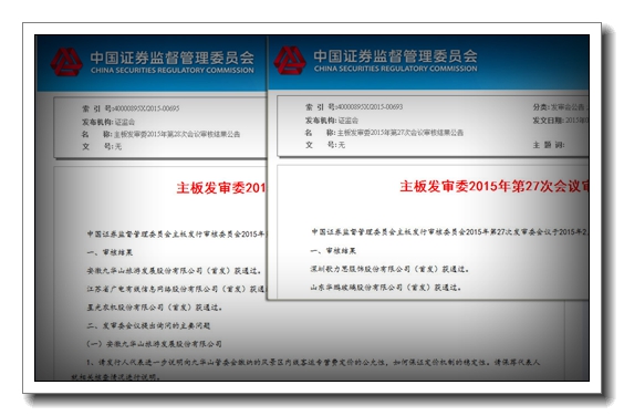 新年伊始,天禾所業(yè)務(wù)捷報(bào)頻傳。2015年2月11日,中國(guó)證券監(jiān)督管理委員會(huì)主板發(fā)行審核委員會(huì)召開(kāi)第27次、第28次發(fā)審委會(huì)議,由天禾律師事務(wù)所擔(dān)任發(fā)行人律師的山東華鵬玻璃股份有限公司、安徽九華山旅游發(fā)展股份有限公司等兩公司首發(fā)分別獲審核通過(guò)。