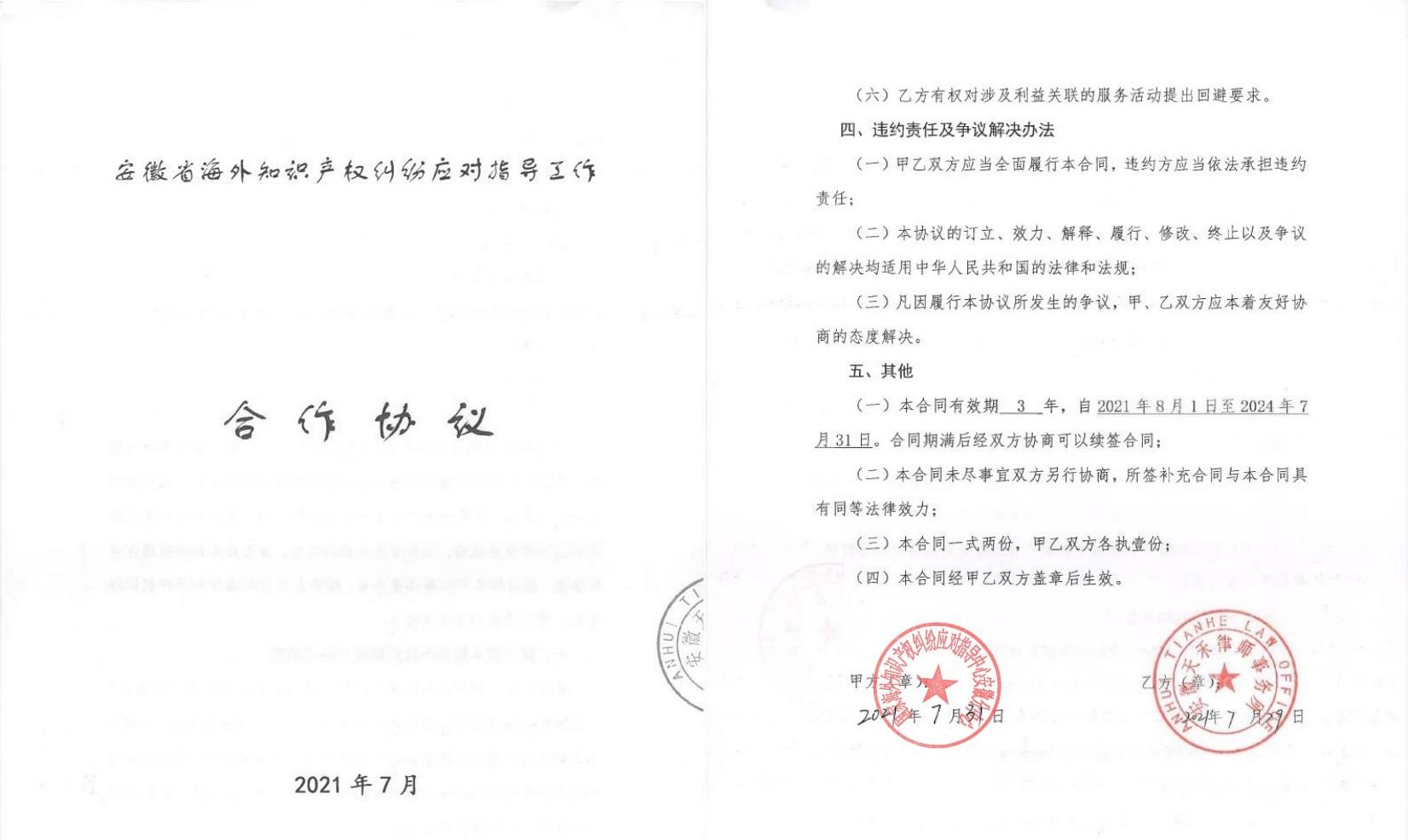 鑒于天禾律所在知識(shí)產(chǎn)權(quán)法律服務(wù)能力方面所具有的突出優(yōu)勢(shì),近日,國(guó)家海外知識(shí)產(chǎn)權(quán)糾紛應(yīng)對(duì)指導(dǎo)中心安徽分中心與天禾律所完成《安徽省海外知識(shí)產(chǎn)權(quán)糾紛應(yīng)對(duì)指導(dǎo)工作合作協(xié)議》的簽訂,本次協(xié)議合作期限三年,天禾律所希望在中心的指導(dǎo)下,能夠更好地為安徽企業(yè)出海護(hù)航。