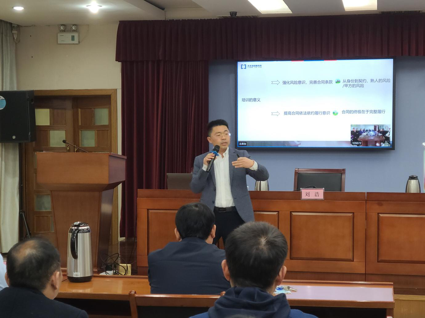 劉浩律師首先談到培訓(xùn)的意義主要為強化員工及公司風(fēng)險意識,完善合同條款,以及提供合同依法依約履行意識;其次先后從買賣合同的構(gòu)成要素、買賣合同起草中的注意要素、買賣合同履行中的注意事項、招投標下買賣合同的特殊規(guī)則四個方面對該中心日常合同的起草及履行過程中須特別加以關(guān)注的問題進行了全面系統(tǒng)的講授;最后從三個視角出發(fā),對本次授課作了重要總結(jié),即其一起草審查合同時,應(yīng)站在未來如發(fā)生爭議,有無對應(yīng)的合同條款可明確適用的視角,其二合同履行過程中,應(yīng)站在每個履行節(jié)點或條件是否存在違約的問題視角,其三,發(fā)生爭議時,應(yīng)站在未來如發(fā)生訴訟,如何能夠贏得訴訟問題的視角。
