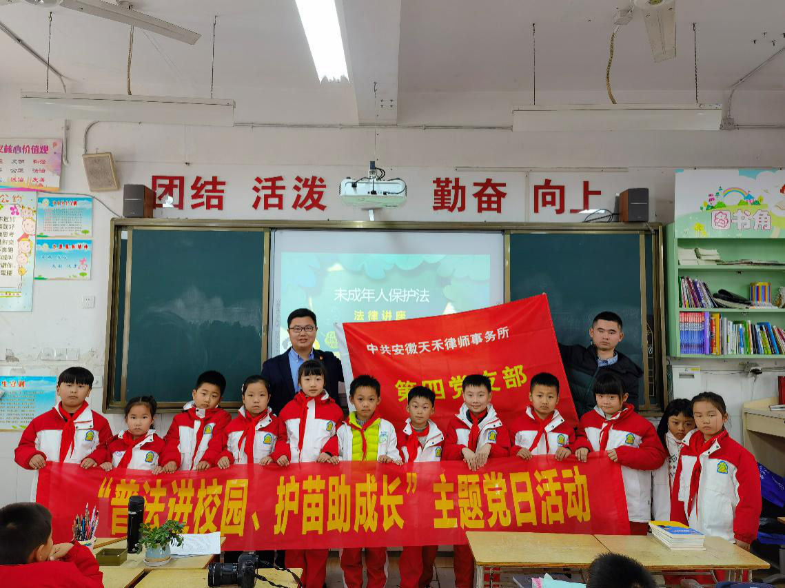2021年12月13日,天禾所第四黨支部組織律師黨員和入黨積極分子,前往合肥市安居苑小學(xué),開展“普法進校園,護苗助成長”的主題黨日活動。